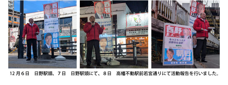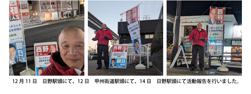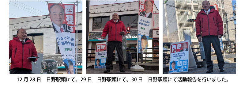 さて、本年は2月8日公示15日投開票の日野市議会議員選挙が行われます。先日、日野市議会議員選挙立候補予定者事前説明会が行われ、定数24名に対し39名の立候補予定者陣営が参加したと聞いており、多数激戦が予想されます。私も都議会議員選挙に2回落選をしましたので、引退を考え日頃よりお世話になっている『西野正人友の会(後援会)』先輩や後輩の皆様にご相談させて頂きました。その結果、日野市民のためまた地域の発展のために頑張れと激励を受け、再び日野市政に挑戦する決意を致しました。