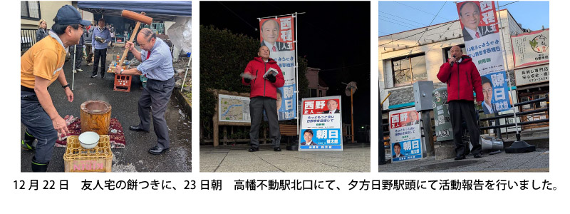 以上、今回は私が思う日野市の課題を4項目挙げさせて頂きましたが、この他にも川辺堀之内区画整理の問題はじめ都市計画道路建設に向けての課題や公共施設老朽化における対応また高齢者介護施設の経営状況問題・災害対策における諸課題など多数ありますが順次お知らせさせて頂きます。本年も西野正人の政治活動にご理解ご協力をお願いします。