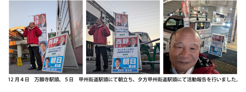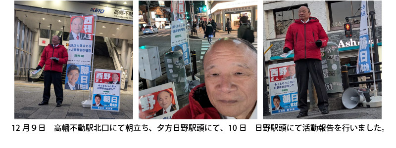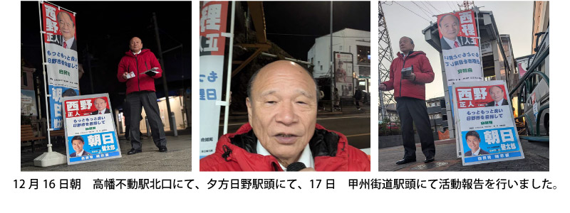 以上、今回は私が思う日野市の課題を4項目挙げさせて頂きましたが、この他にも川辺堀之内区画整理の問題はじめ都市計画道路建設に向けての課題や公共施設老朽化における対応また高齢者介護施設の経営状況問題・災害対策における諸課題など多数ありますが順次お知らせさせて頂きます。本年も西野正人の政治活動にご理解ご協力をお願いします。
