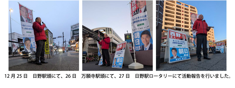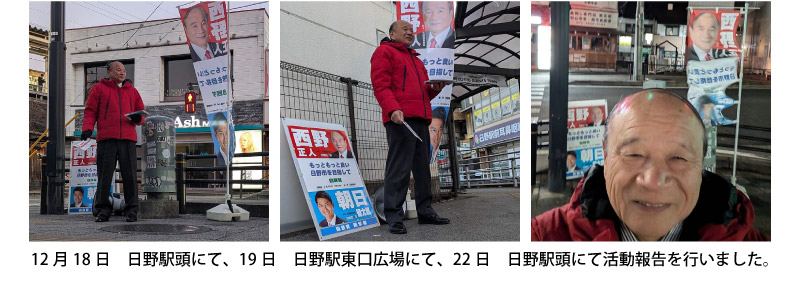 さて、本年は2月8日公示15日投開票の日野市議会議員選挙が行われます。先日、日野市議会議員選挙立候補予定者事前説明会が行われ、定数24名に対し39名の立候補予定者陣営が参加したと聞いており、多数激戦が予想されます。私も都議会議員選挙に2回落選をしましたので、引退を考え日頃よりお世話になっている『西野正人友の会(後援会)』先輩や後輩の皆様にご相談させて頂きました。その結果、日野市民のためまた地域の発展のために頑張れと激励を受け、再び日野市政に挑戦する決意を致しました。