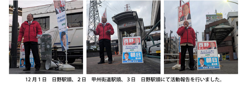 さて、本年は2月8日公示15日投開票の日野市議会議員選挙が行われます。先日、日野市議会議員選挙立候補予定者事前説明会が行われ、定数24名に対し39名の立候補予定者陣営が参加したと聞いており、多数激戦が予想されます。私も都議会議員選挙に2回落選をしましたので、引退を考え日頃よりお世話になっている『西野正人友の会(後援会)』先輩や後輩の皆様にご相談させて頂きました。その結果、日野市民のためまた地域の発展のために頑張れと激励を受け、再び日野市政に挑戦する決意を致しました。