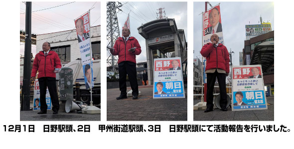 今回の衆議院選挙は日野市議会議員選挙前の選挙期間だったため、市議会議員選挙立候補予定者は衆議院選挙期間中は政治活動もできない状況下での応援でしたが、私は積極的に小田原選対にて遊説計画・日野担当の決起大会・日野での最終打ち上げの担当として頑張った次第ですが、さすがに7日夜最終の立川駅での11時59分59秒まではお手伝いできませんでした。そのような中、8日は日野市議会議員選挙の戦いが始まりましたが実際のところ衆議院選挙が行われることもあり、準備不足は否めず不安の中での選挙戦となりました。